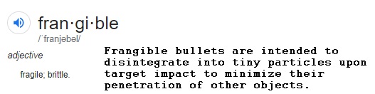 Frangible is a descriptive term used to describe anything that is capable of being broken or possessing the property of being fragile. Practically anything can be frangible, depending upon the circumstances. Your car seems built solidly enough, but drive it into a concrete barrier at 65 mph if you want to test its frangibility. A frangible bullet (or slug) is designed to survive being discharged from a firearm intact, but will break into pieces upon impact with the target. The harder the target, the smaller the pieces the projectile breaks into.